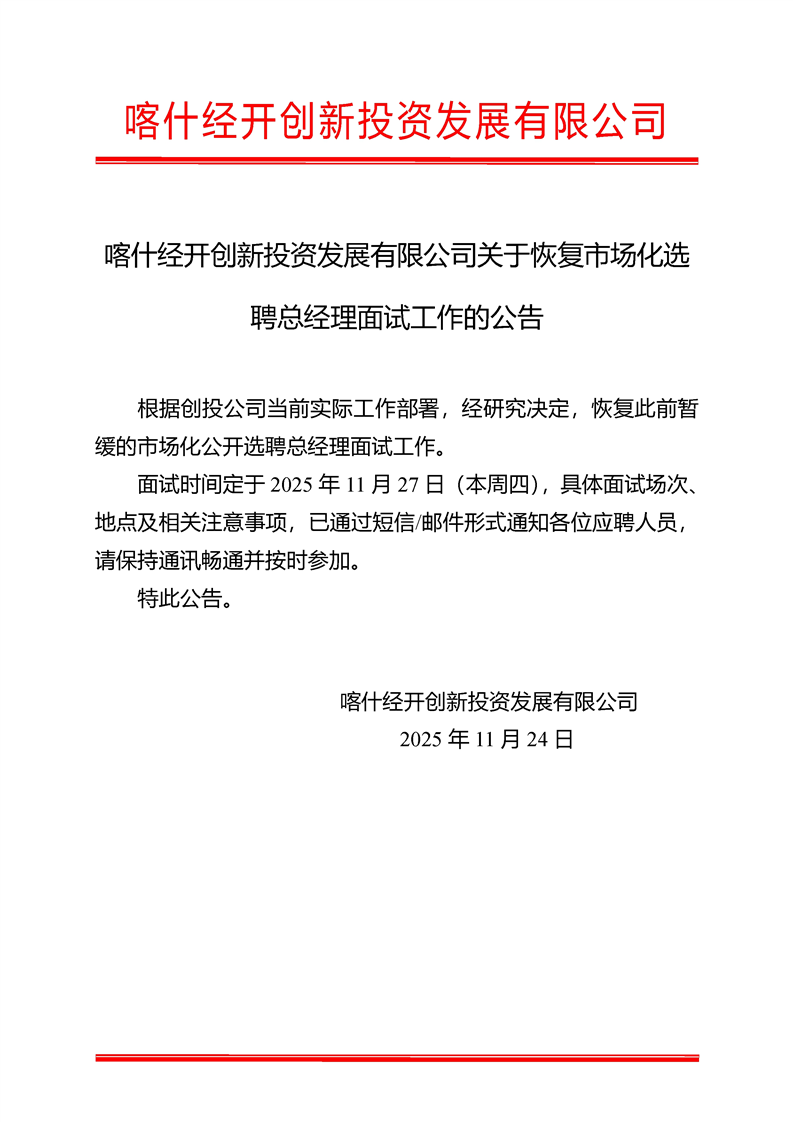 喀什经开创新投资发展有限公司关于恢复市场化选聘总经理面试工作的公告