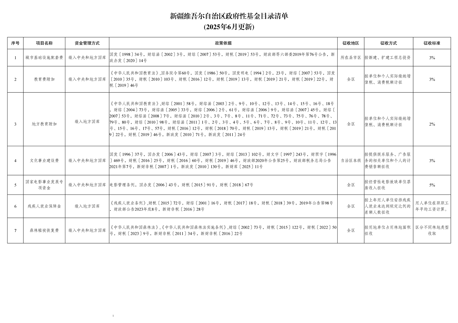 新疆维吾尔自治区政府性基金目录清单(2025年6月更新)
