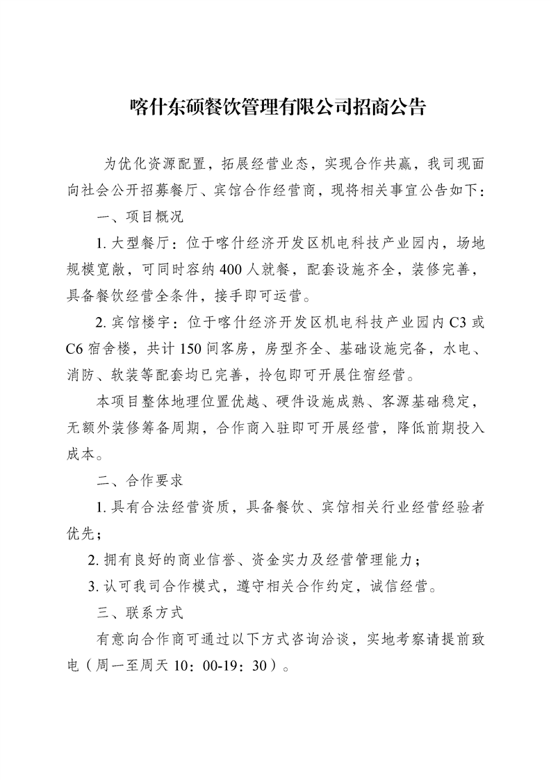 喀什东硕餐饮管理有限公司招商公告
